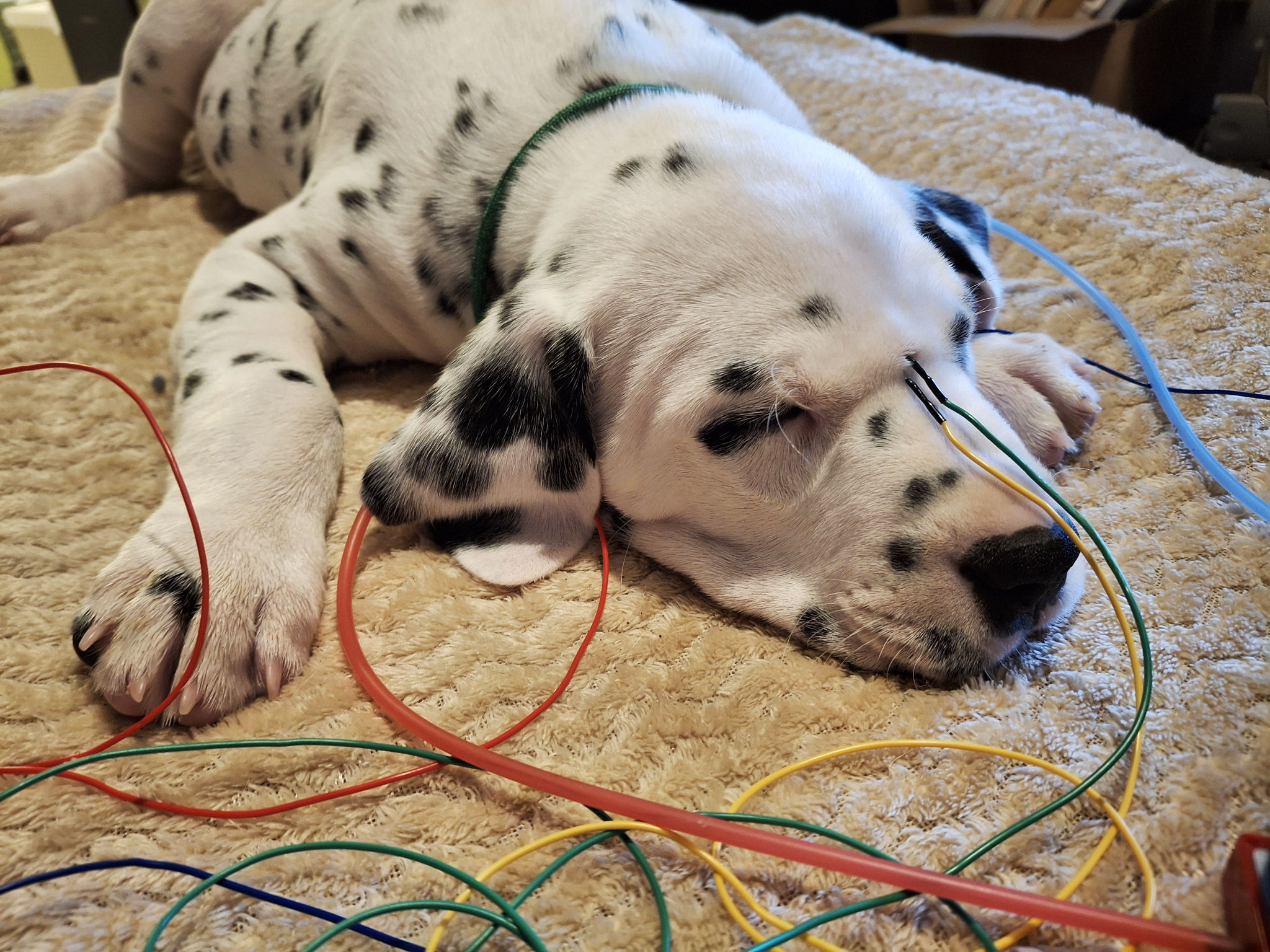 Bei der AEP (akustisch evozierte Potentiale) werden über kleine Kopfhörer Töne direkt in die Gehörgänge eingespielt. Über spezielle Messpunkte am Kopf misst der Tierarzt die Reaktionen des Gehirns auf unterschiedliche Frequenzen. So lässt sich genau feststellen, ob ein Welpe hohe oder tiefe Töne wahrnimmt und ob er einseitig oder beidseitig hörend ist. Für beide Ohren werden separate Messkurven aufgezeichnet. Verläuft eine Kurve nahezu flach, deutet dies auf Taubheit hin – was bei etwa 1 % der Dalmatiner vorkommt.