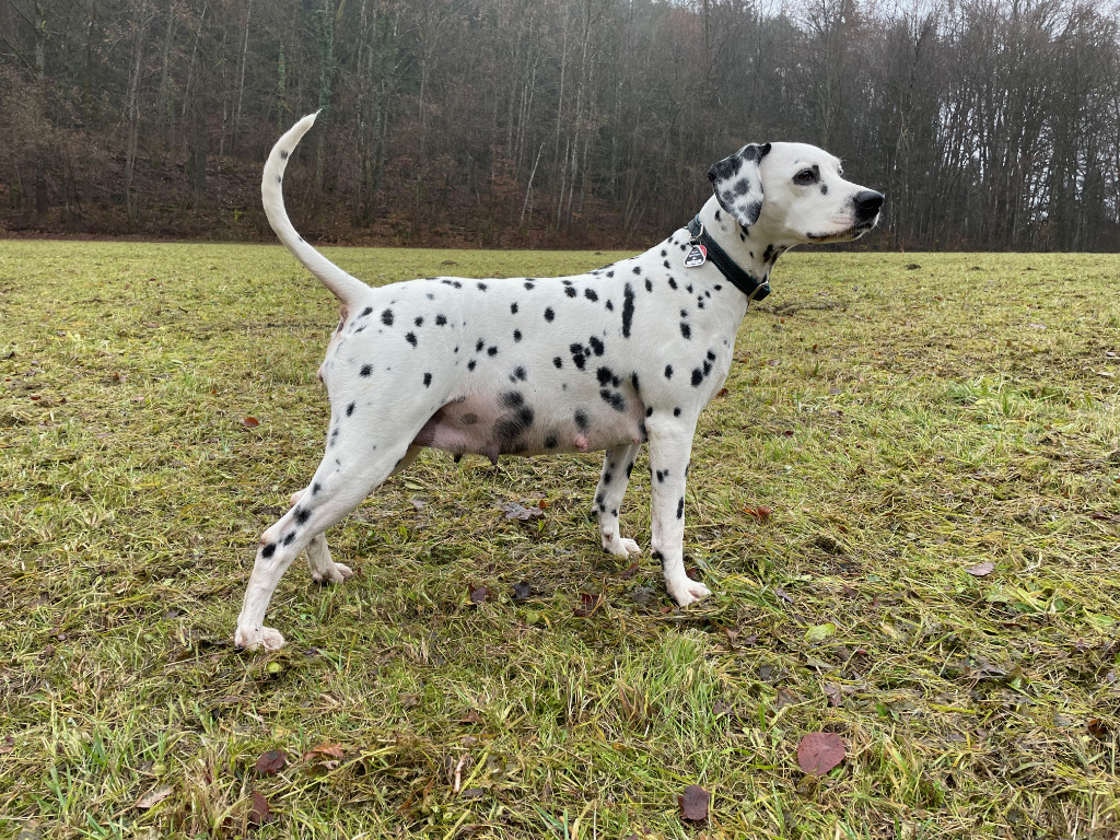 Nach 6 Wochen Trächtigkeit ist es schon gut zu sehen, wie Sima’s Bäuchlein wächst. Es geht ihr gut – sie ist fröhlich wie immer. Ihre Aktivität lässt naturgemäß jetzt aber schon nach. Auch ist sie anhänglicher als sonst und weicht kaum von unserer Seite. Die Futterrationen haben wir erhöht, wobei das natürlich auch einer Dalmatinerhündin, die nicht trächtig ist gefallen würde.